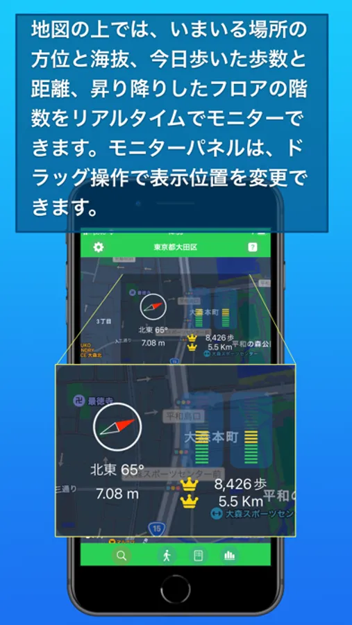 地図画面の上では、いまいる場所の方位と海抜、今日歩いた歩数と距離、昇り降りしたフロアの階数をリアルタイムでモニターできます。モニターパネルは、ドラッグ操作で表示位置を変更できます。