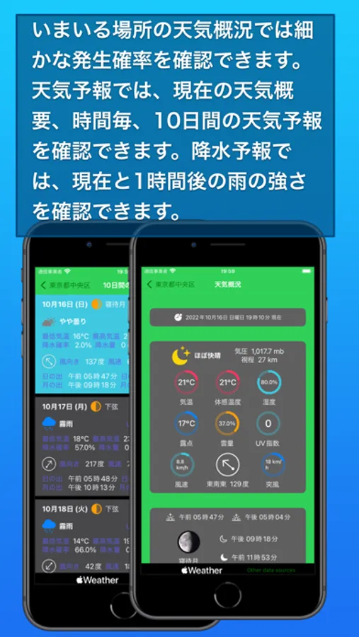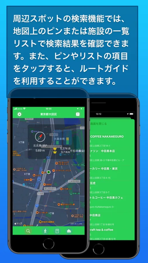 ウォーキングの便利なアシスト機能として、コンビニやトイレなど周辺スポットの検索機能と、現在いる場所の天気概況、天気予報、降水予報などの検索機能を用意しています。