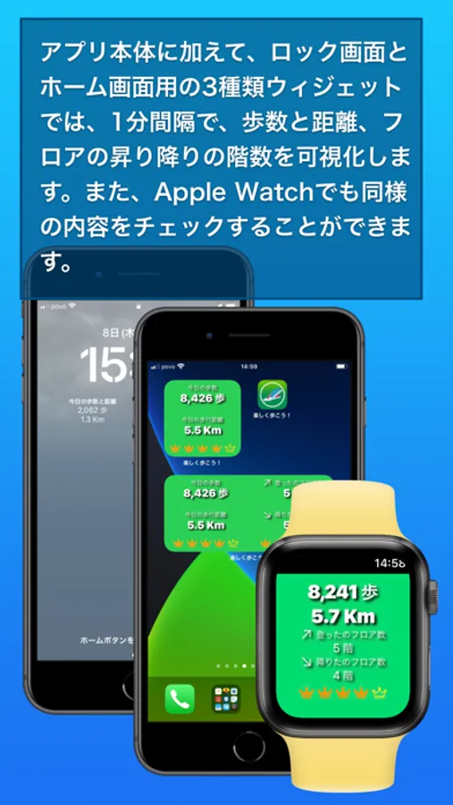 アプリ本体に加えて、ホーム画面用のウィジェット(2種類)では、1分間隔で、歩数と距離、フロアの昇り降りの階数を可視化します。ロック画面用のウィジェット(1種類)では、1分間隔で、歩数と距離を表示します。また、Apple Watchでも同様の内容をチェックすることができます。