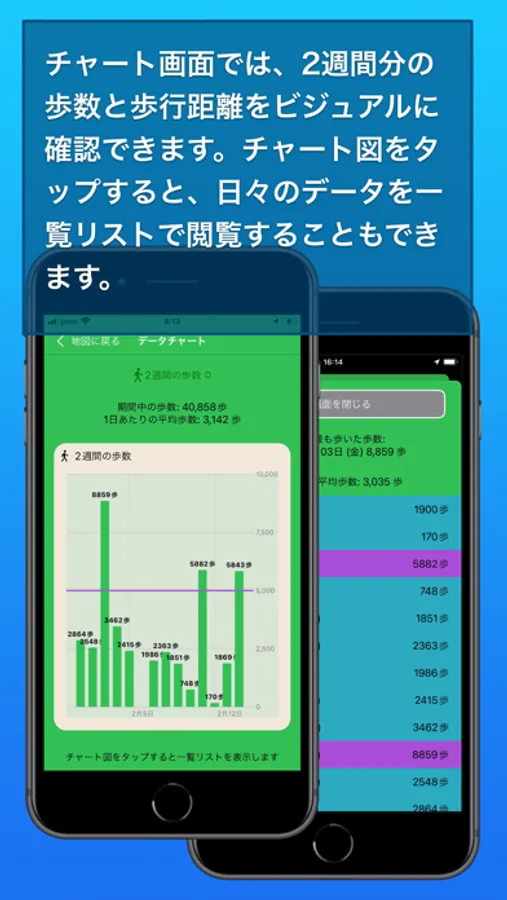 チャート画面では、2週間分の歩数と歩行距離、血圧の推移、アクティビティをビジュアルに確認できます。1日あたりの平均歩数と距離、2週間分の実績の集計値などを掲載していますので、週の達成度確認に役立ちます。また、2週間分の実績を一覧リストでも閲覧できます。