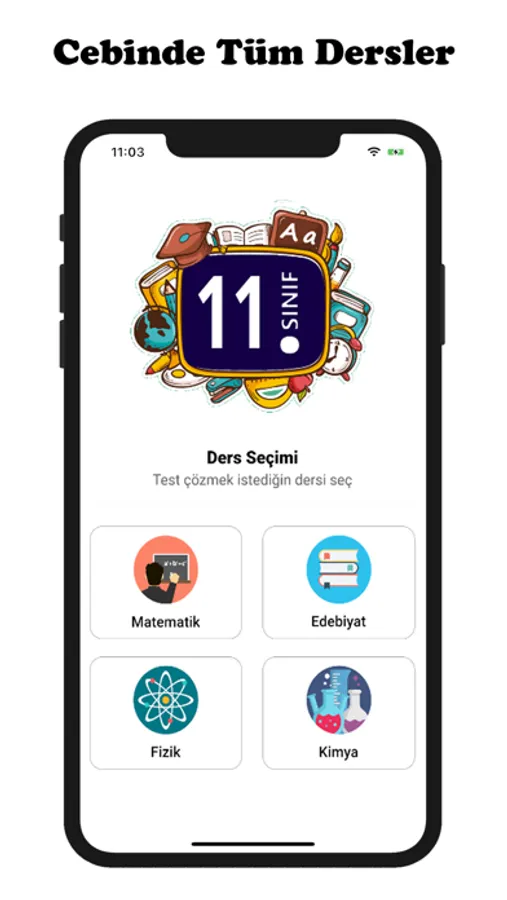 11.Sınıf Tüm Dersler uygulaması her nerede olursanız olun derslerinize çalışmanıza imkan sağlamaktadır . Konu testlerini çözerek bilgilerinizi pekiştirerek konuları birer birer bitirebilirsiniz.