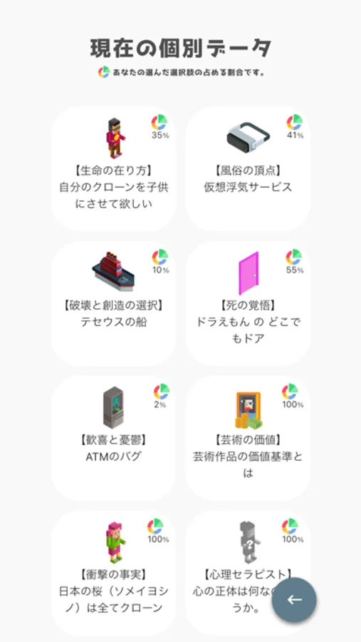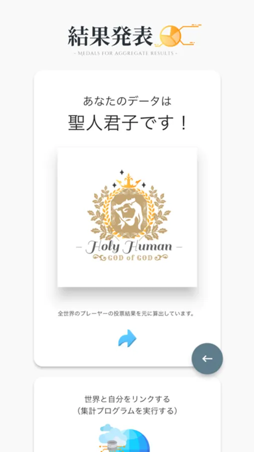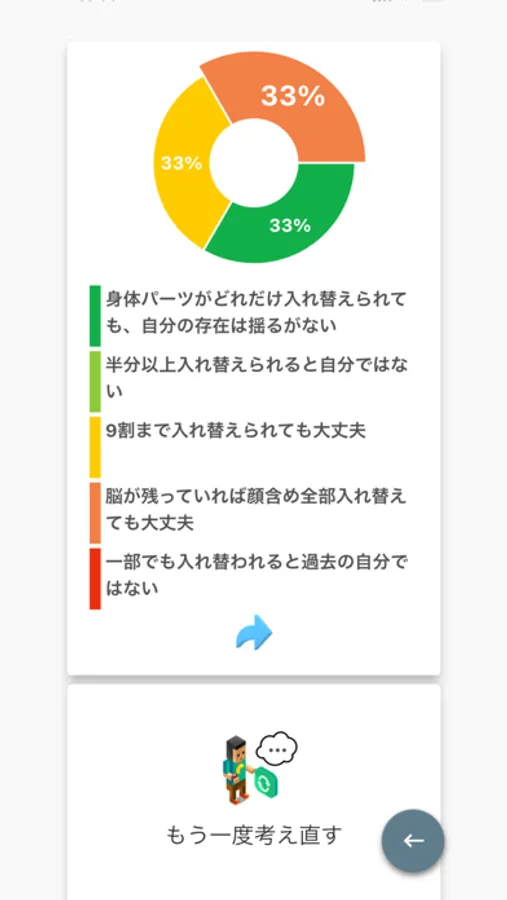 さらに、あなたの投票結果の比率をもとに、あなたの選択肢が多数派なのか少数派なのかを計算して思考タイプの診断結果を表示します。