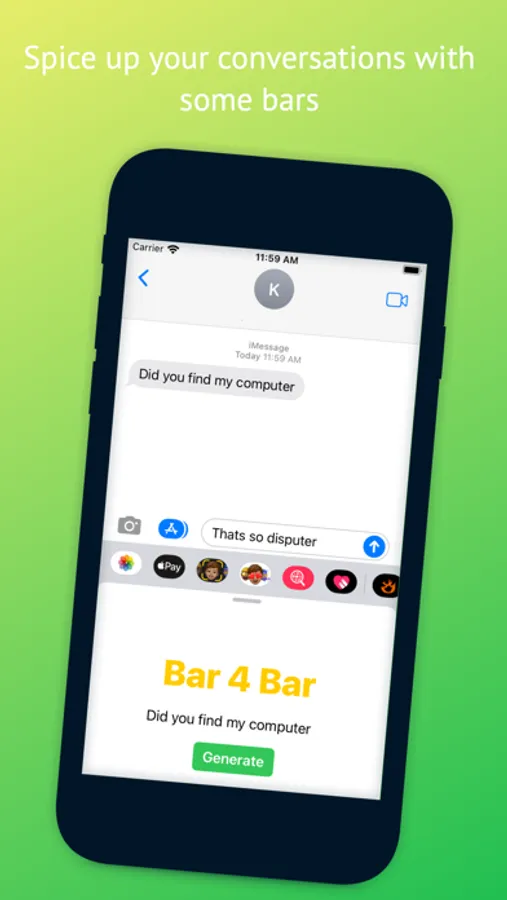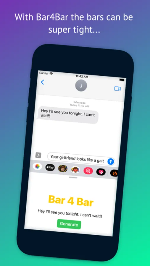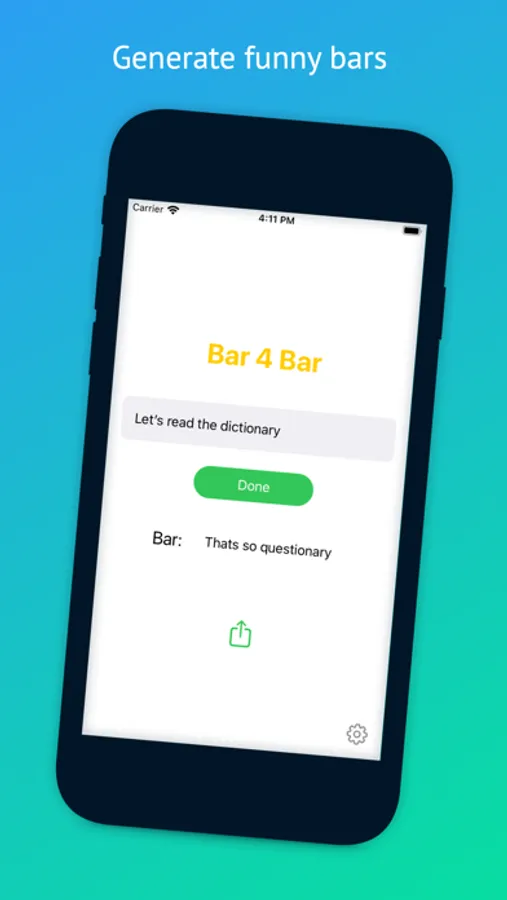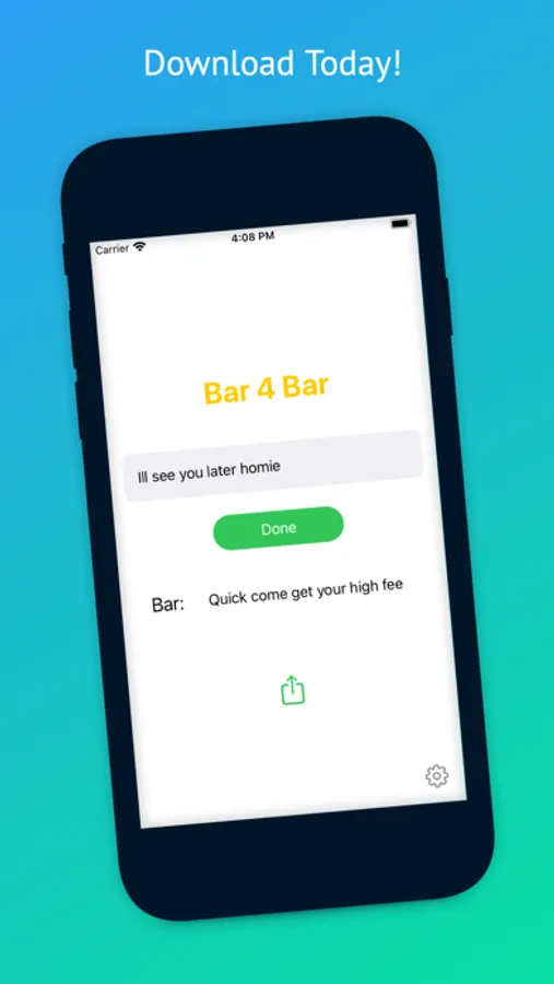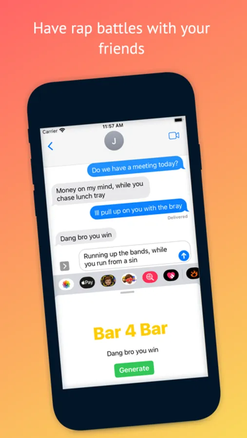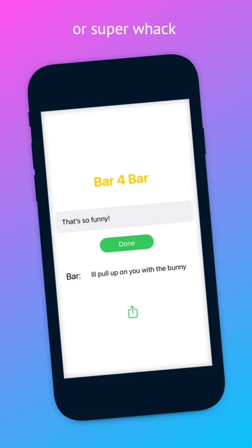 Bar 4 Bar is a bar generator that will make funny, tight, and occasionally whack bars. Bar 4 Bar is both an app and an iMessage extension so you will always be ready for a rap battle. Punch in text, press generate, and be amazed...