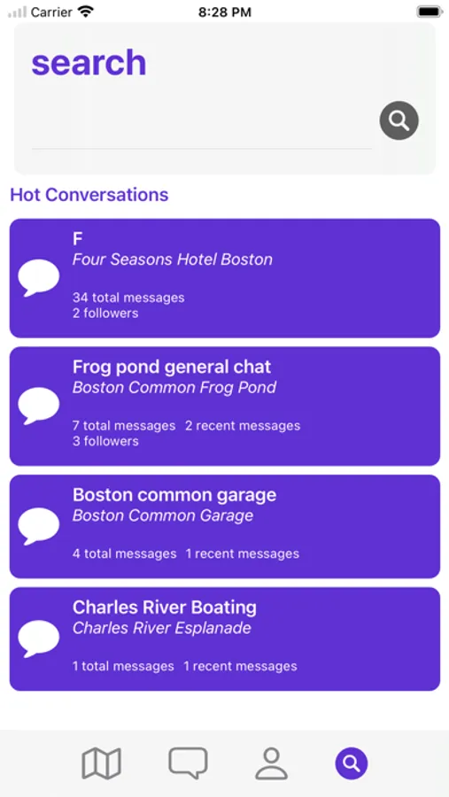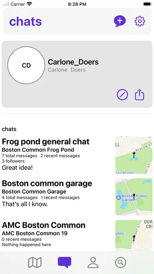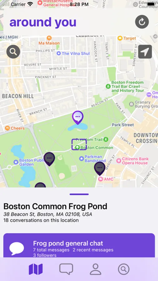 Each chatroom has a location on the map, discover chatrooms around the world or any place you are interested in and join the discussion.