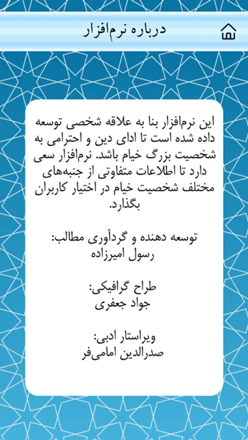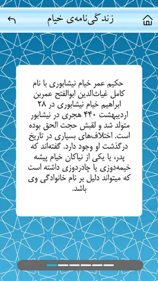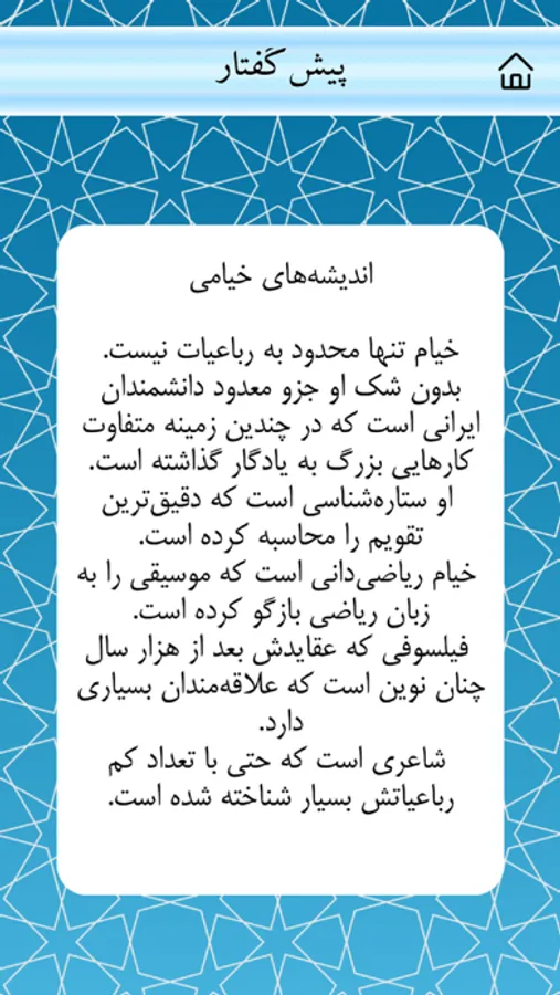 هدف از این آپلیکشین آشنایی بیشتر کاربران با ابعاد مختلف شخصیتی حکیم عمر خیام نیشابوری است و صرفا به رباعیات پرداخته نمیشود.