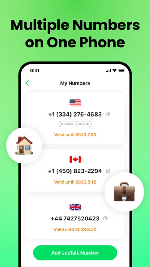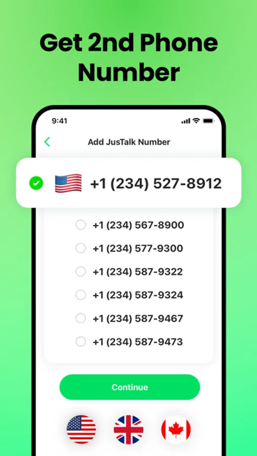 JusTalk 2nd Phone provides you with real numbers in different countries at low prices: US, GB, and CA.