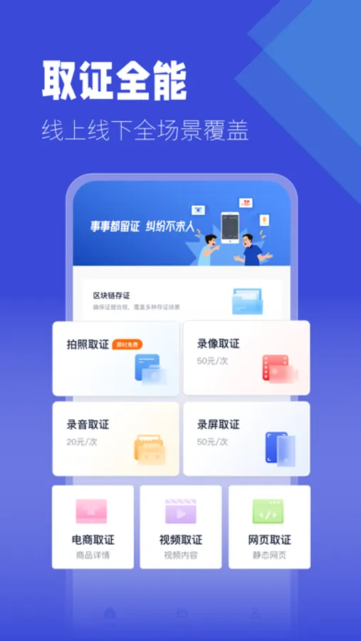 您可随时通过本软件进行拍照取证、录像取证、录音取证、录屏取证、网页取证等操作,从而客观记录事物状态、当事人行为、当事人言论、聊天记录、网页内容、软件内容等信息,并将其作为民商事纠纷中的电子数据证据使用,为您依法维护自身权益提供坚实的证据基础。