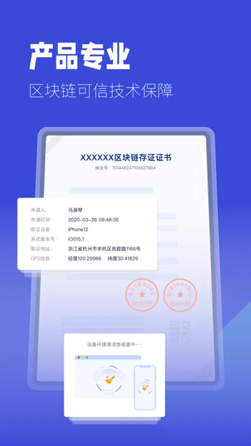 在掌上取证成功对您的电子数据文件进行区块链存证之后,您将会取得由保全网与杭州互联网公证处共同签发《电子数据区块链存证证书》,用于证明对应电子数据自存证成功起已经存在并且内容保持完整,未被篡改。