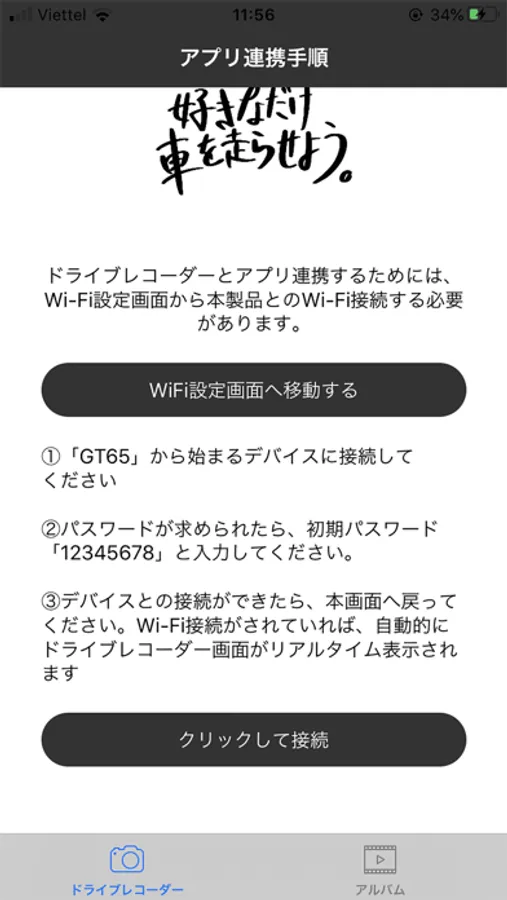 本製品はJAPAN AVE.製ドライブレコーダー(GT65)とWiFi連携をして、リアルタイムで録画映像をスマホで確認できるアプリです。また、録画した映像はスマホから視聴可能です。