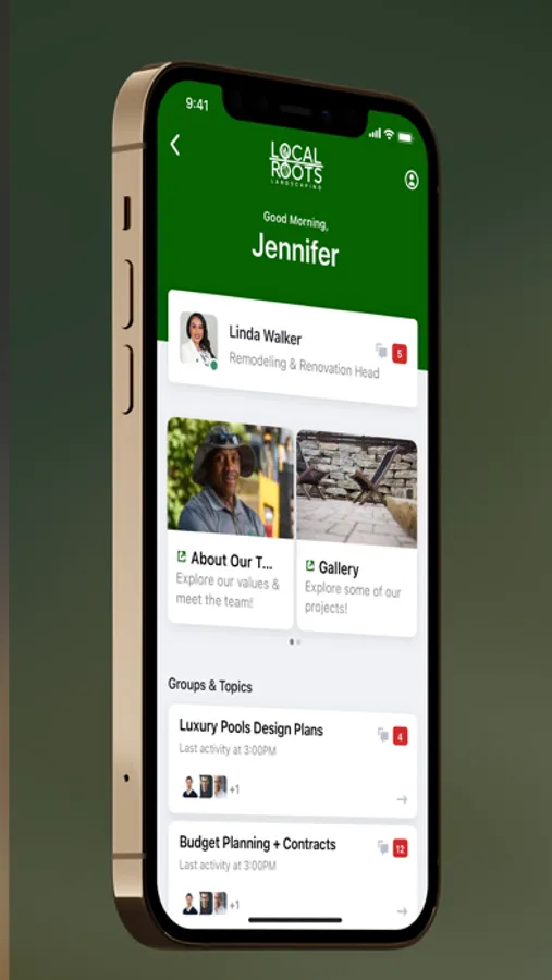 Use Local Roots to communicate with our team throughout the design and construction process via text, audio, and video messaging. The secure portal also supports video conferencing, eSignature, document and file sharing, virtual walkthroughs, and more collaboration capabilities all in one place.
