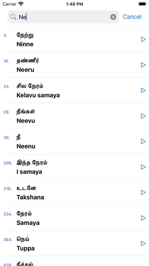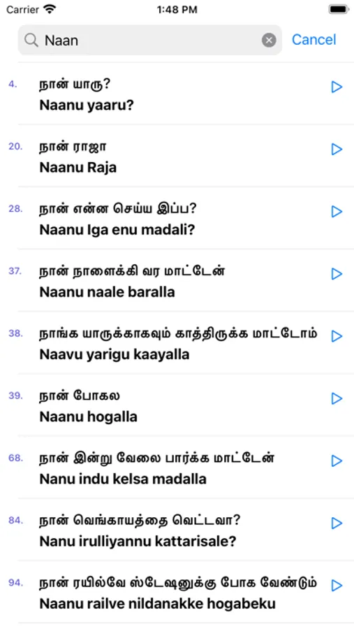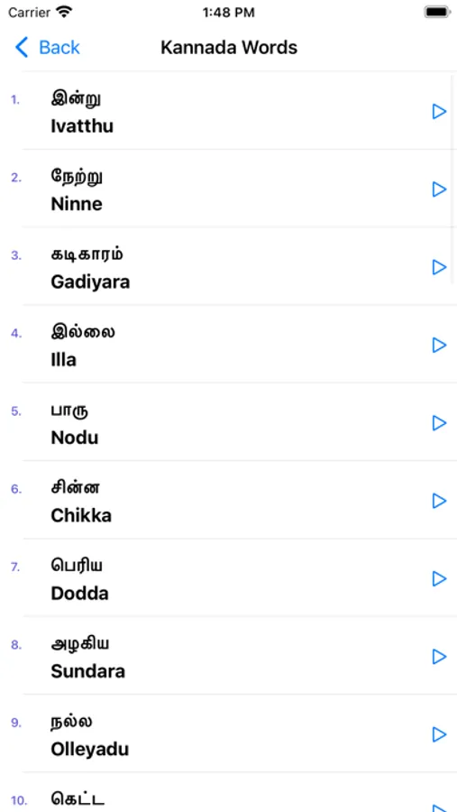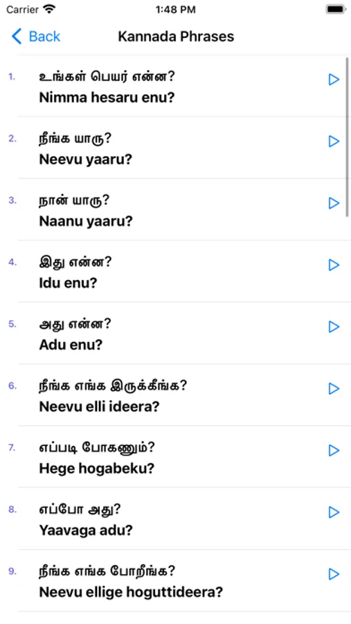 This app helps you to learn spoken Kannada through Tamil without having to learn Kannada letters. It has more than 300 daily used phrases/sentences with audio and 500 Kannada words with pronunciations, so you can successfully learn Kannada on your own by downloading this app.