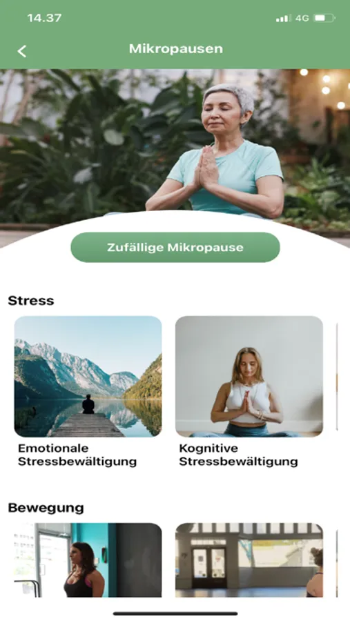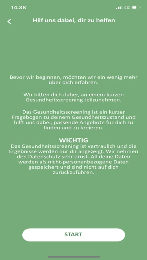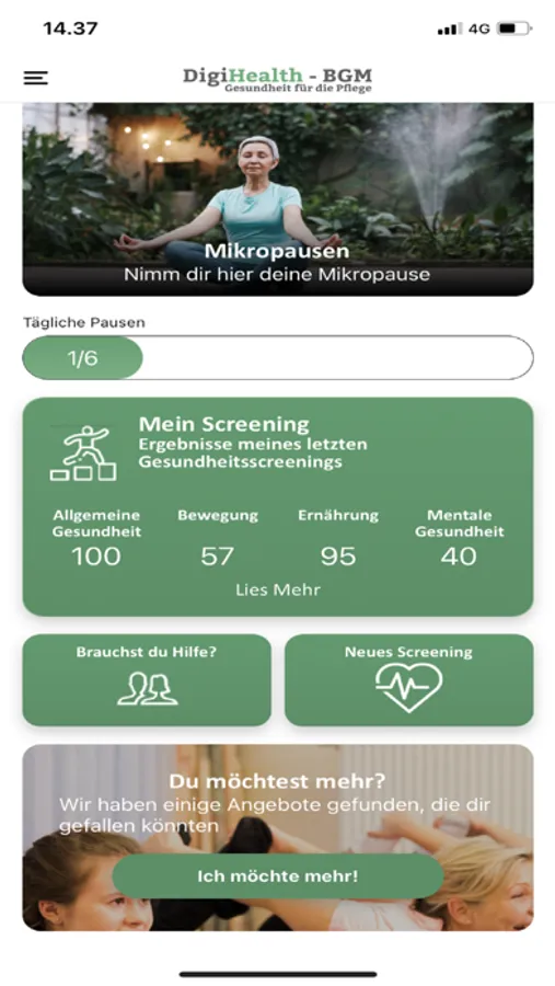 Mit einem kurzen Gesundheitsscreening erhalten Sie einen Einblick über ihren aktuellen Gesundheitszustand und über die Bereiche, auf die Sie sich konzentrieren sollten. Darauf aufbauend erhalten sie kurze Pausen in verschiedenen Kategorien, die Ihren Bedürfnissen entsprechen – egal ob es sich um körperliche oder geistige Gesundheit handelt.
