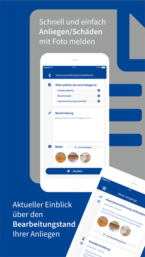 Als Mieter oder Eigentümer können Sie Schäden oder Anliegen direkt mit Fotos über unsere App melden. Ihre Anfragen stehen unseren Mitarbeiten dann zur Verfügung und können auch an Handwerksbetriebe weitergeleitet werden.