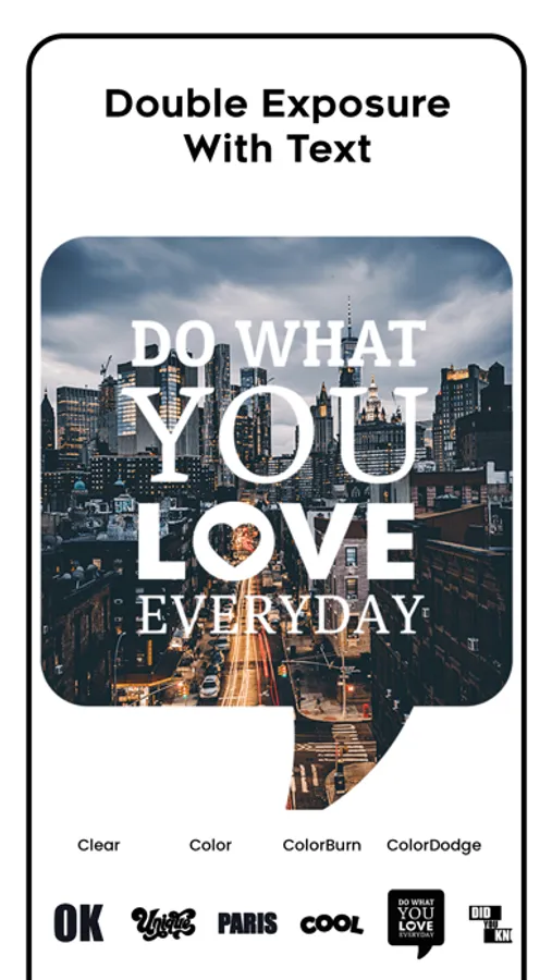 - Auto blending. Blend two photos together and create a Double Exposure Effect.