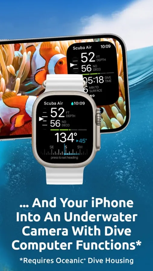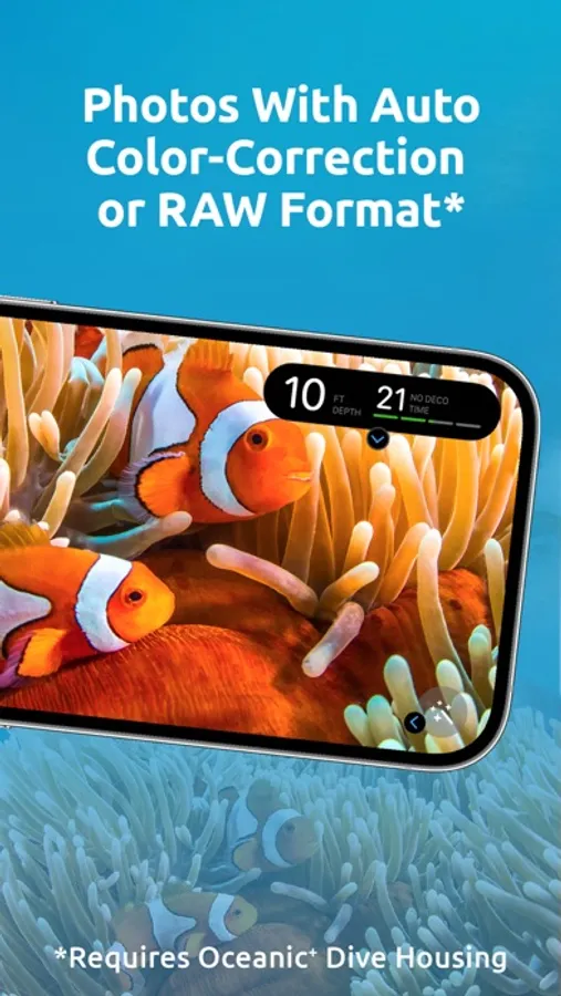 • With the Oceanic+ Dive Housing (available separately at Oceanic Worldwide), take vibrant underwater photos and videos that are automatically color-corrected. Combine this with advanced editing tools (available in the premium version) and your iPhone's dual capabilities as a dive computer and an underwater camera, ensuring each dive becomes a story waiting to be told.