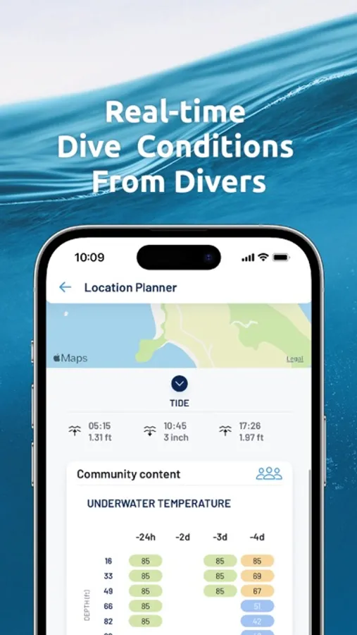 • Pre-Dive Location Planner with Surface & Water Conditions, including detailed water temperatures at various depths and community-sourced visibility and currents.