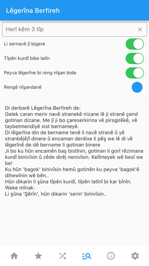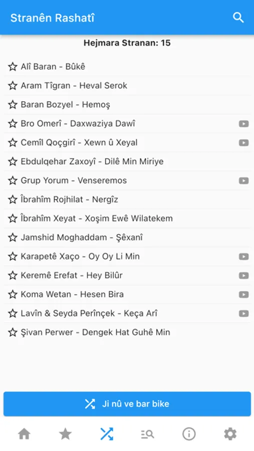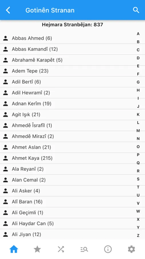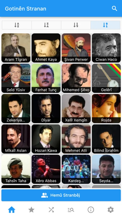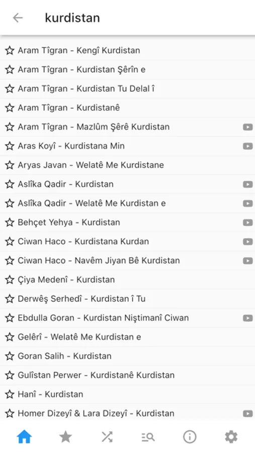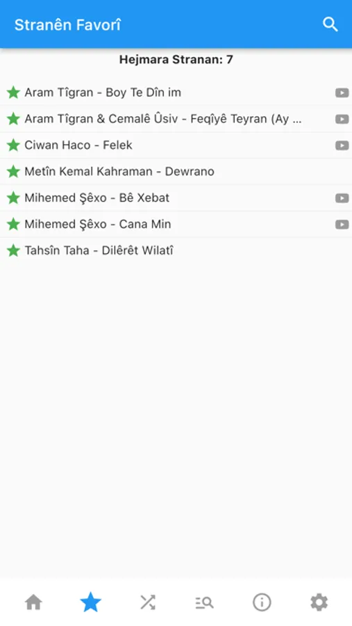Di sepanê de nêzî 7000 zêdetir gotinên stranan û ji 800î zêdetir stranbêj hene. Bi lêgerîna berfireh mirov dikare di nav gotinên stranê de jî lêgerînê bike. Ku bikarhêner ji stranekê hez bike dikare wê stranê bike favorî an jî parve bike.