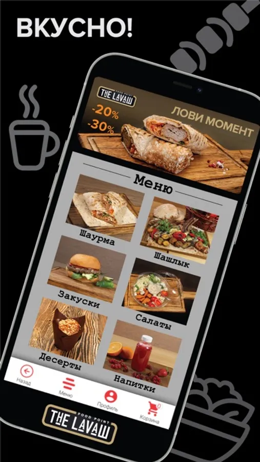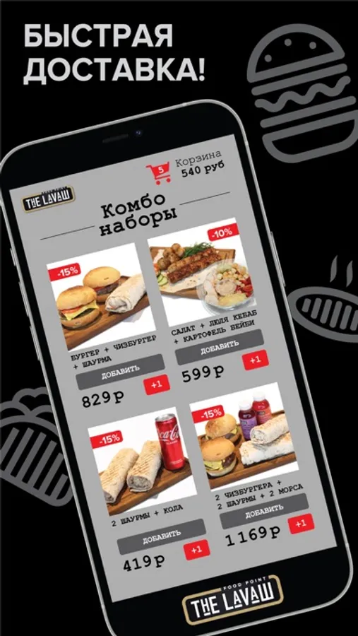 Как сделать заказ в приложении The Lavaш: выберите понравившиеся позиции из меню, добавьте их в корзину.