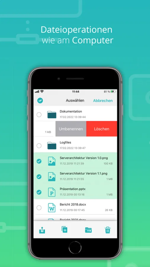 Laden Sie Fotos, Präsentation oder Office-Dokumente zur Bearbeitung direkt auf das Mobilgerät herunter oder legen Sie Dateien bequem auf dem Fileserver ab. Durch eine sicherere Verbindung vom Mobilgerät zum Server sind Ihre Daten dabei stets geschützt. Da sich jeder Nutzer mit seinen Unternehmensanmeldedaten authentifizieren muss, werden die vorhandenen Zugriffsrechte verwendet.