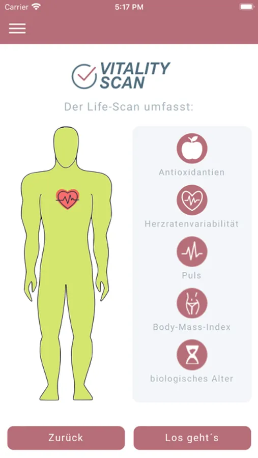 Life Scan bietet Kernfunktionen, um Ihren Körper fit zu halten. Behalten Sie mit einem kurzen Scan den Antioxidantienwert, Ihre Herzratenvariabilität, Ihren Puls und Ihr biologisches Alter im Auge. Schaffen Sie sich täglich einen Überblick über Ihre Werte und checken sie so ganz einfach von Zuhause oder unterwegs Ihren Fitnesszustand in Sekunden. Diese Werte können Sie sich ganz einfach über unsere kostenlose Life-Scan App auf Ihrem iOS Smartphone oder Tablet anzeigen lassen. Zudem erhalten Sie in der Life-Scan App Instruktionen zur richtigen Handhabung des Life-Scan Scanners, um zuverlässige Werte zu erhalten.