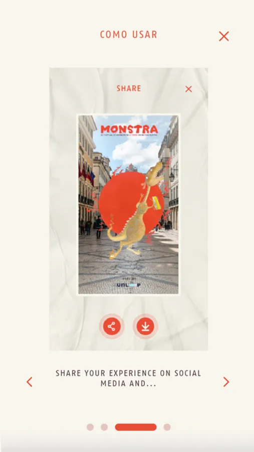 Set MONSTRA loose in your city through your screen! Place animated characters and illustrations in your surroundings through augmented reality. Create your own MONSTRA festival picture, save it in the app gallery or share it with the world.