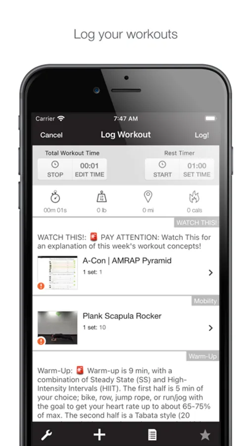 DAILY - Your daily workout is structured into four components; Mobility, Warm-up, Work, and a cardio Finisher. Every exercise comes with reps, sets, and rest periods, as well as a video demonstration.