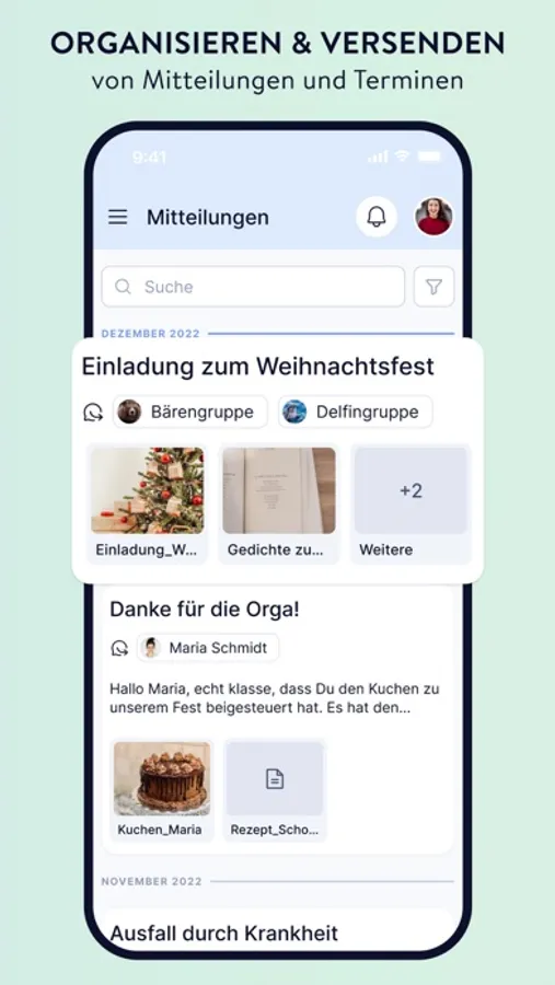 • Alle wichtigen Kita-Infos (Mitteilungen, Termine, wichtige Neuigkeiten) verfassen und an die hinterlegten Bezugspersonen versenden. Ob einzelne Elternteile oder die ganzen Kita-Gruppe – mit einem Klick sind alle auf dem neuesten Stand. Die direkte digitale Erreichbarkeit der Eltern schafft Ressourcen und unterstützt alle Beteiligten bei Ihrer Planung.