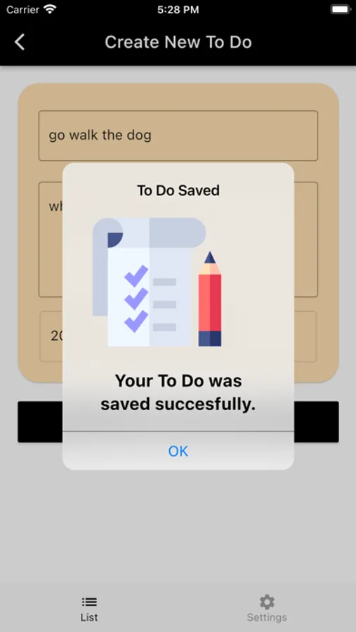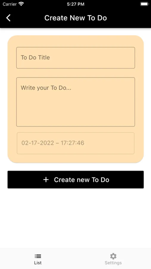 Press the plus button to start creating your first to do. After then you will see a title, a content and a date time picker for your todo. Press create and you are ready to go.