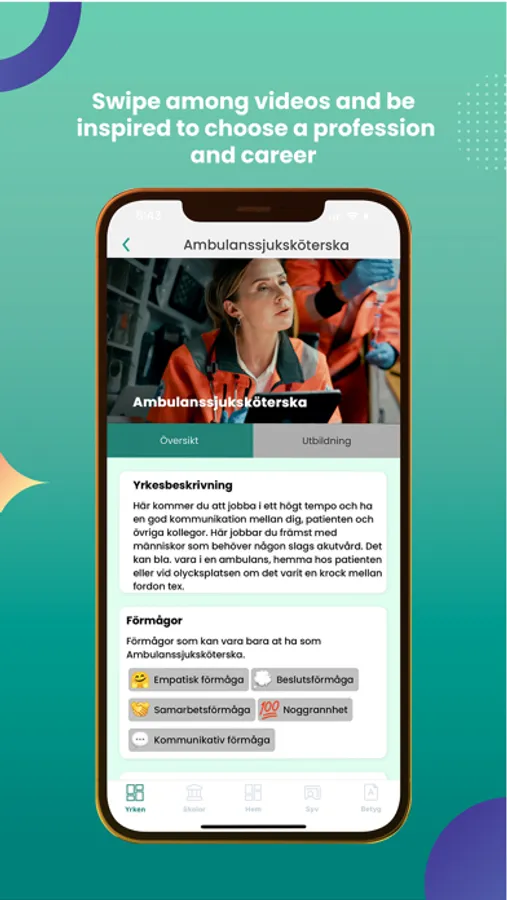 Digital SYV content is validated and targeted to those who want to increase their knowledge of the various choices available before upper secondary school. In the app, we have collected a lot of information that is intertwined and presented in a creative and dynamic way. Digital SYV offers a personification that makes the choice of upper secondary school easier, more fun and exciting by inspiring the choice of profession and career. Digital SYV can be used by all students in primary school and is suitable for parents as well as guidance counselors who want to help the child's choice of education and profession.
