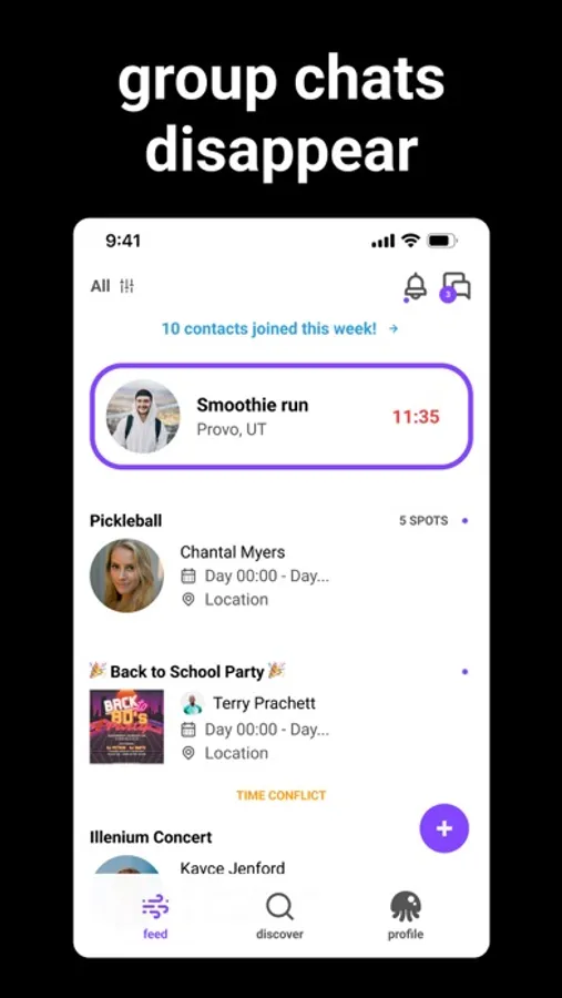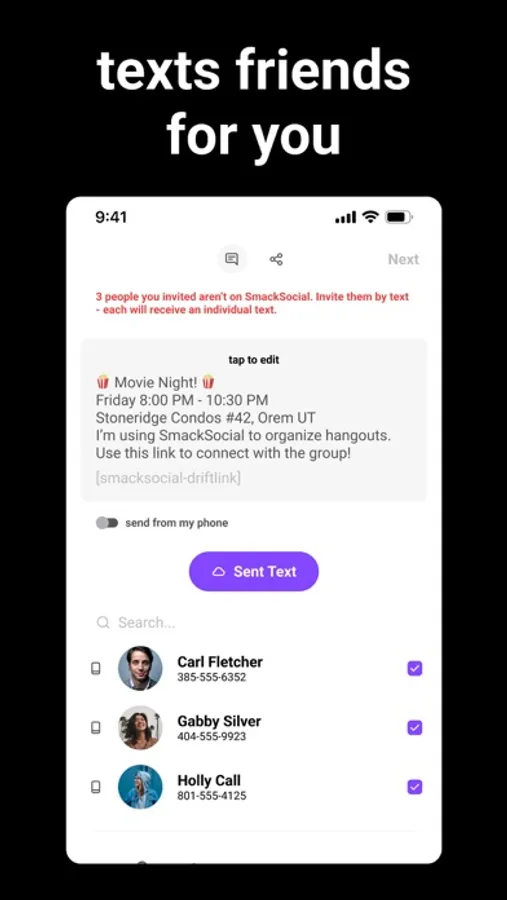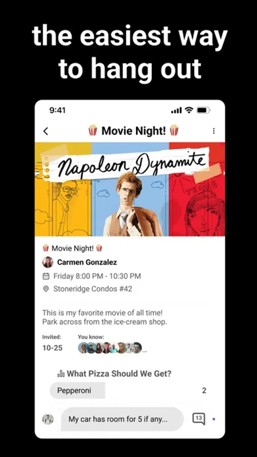 Everything from pickleball matches to movie nights, coordinate with your friends in one place. With the tap of a button everyone has the same info even if they're not on the app. Text, Instagram, Snapchat, GroupMe - everyone has the same link.