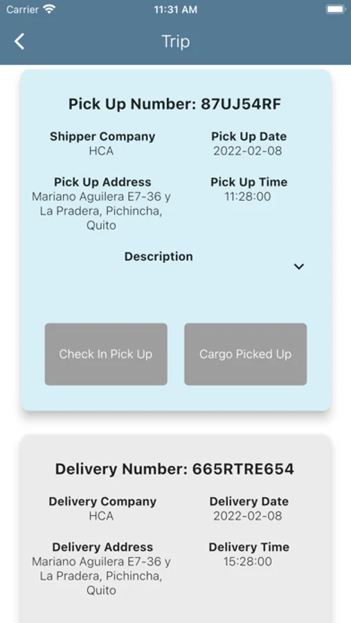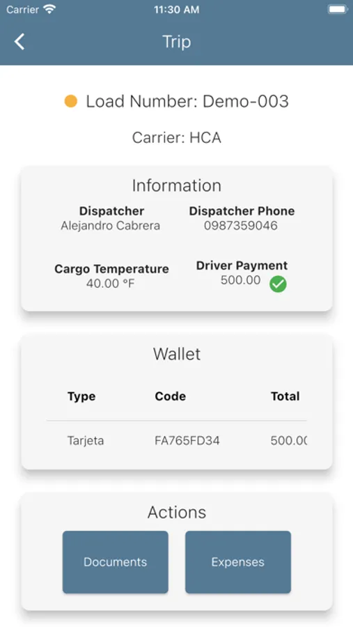 - On the mobile app, drivers access to the assigned loads/trips and register documentation, pickups and deliveries actions and expenses.
