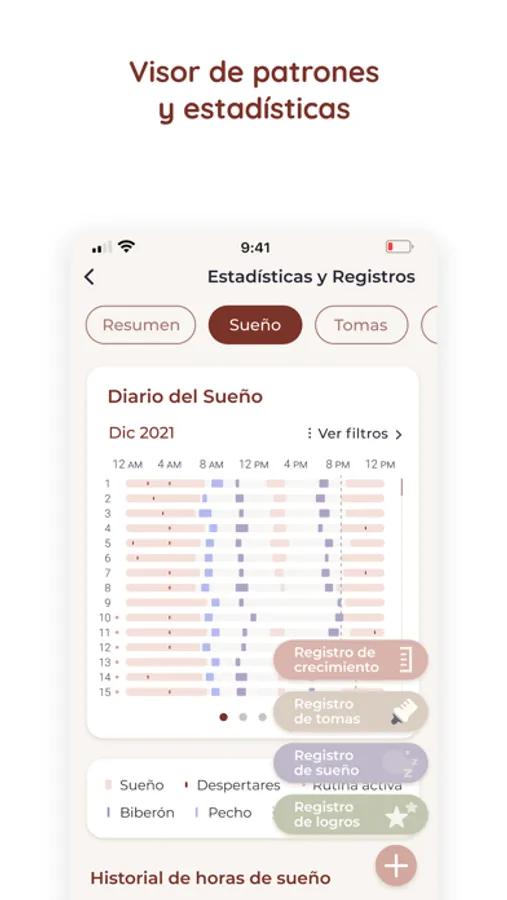 Además de su potente funcionalidad de visualización de patrones (sueño, crecimiento y alimentación), dispondrás de la mejor guía de consejos y un reproductor de sonidos blancos que ayudarán a tu bebé a conciliar el sueño de manera activa.