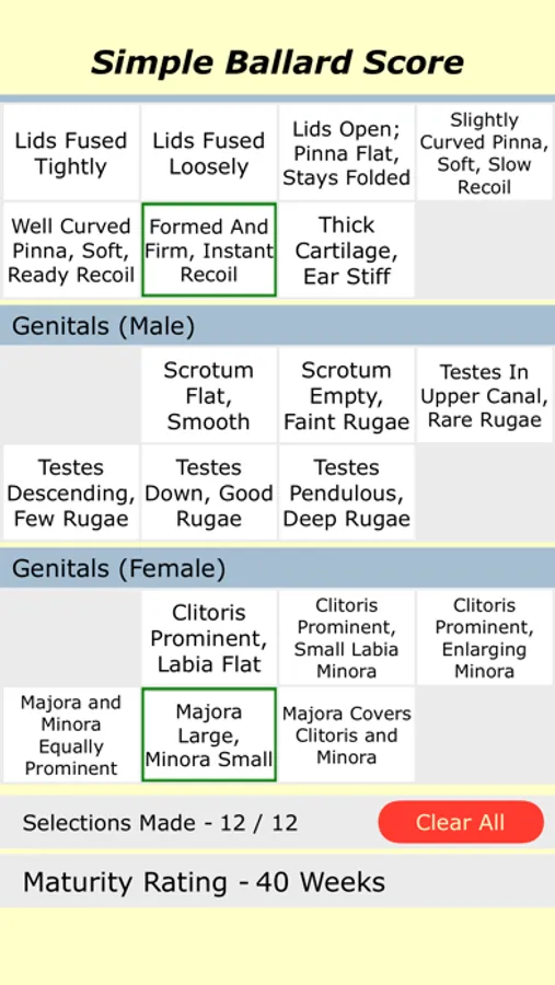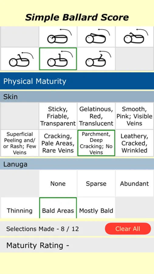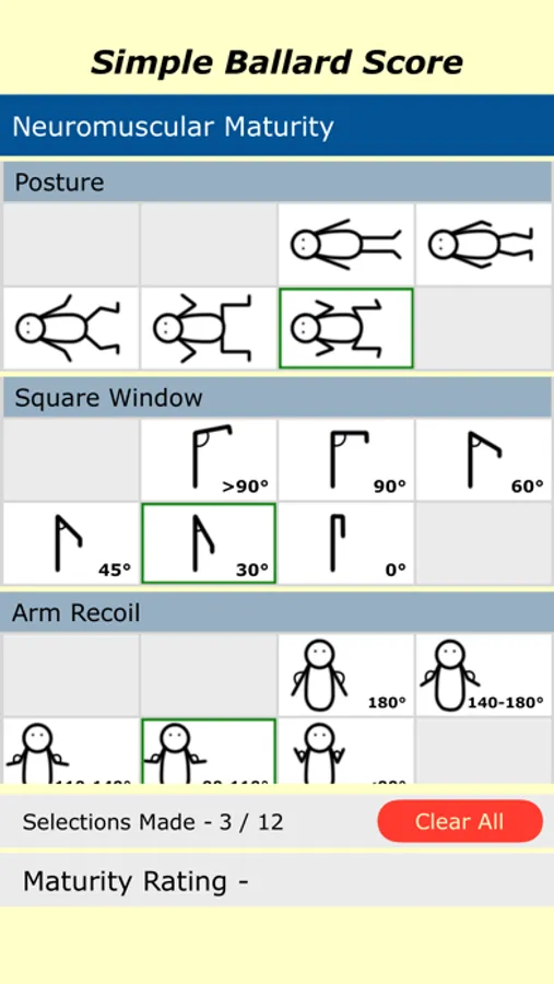 This app is intended only for trained medical personnel practiced in Ballard scoring newborn infants. If attempting to use this app without proper training, please consult with a properly educated medical provider.