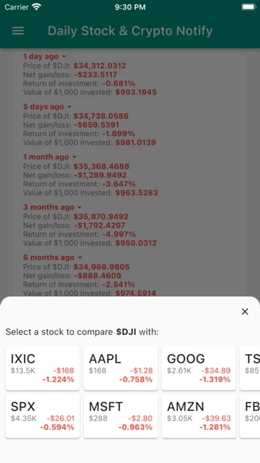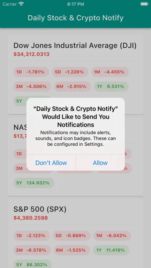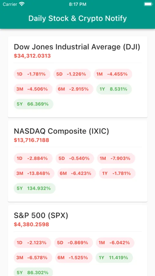 Daily Stock and Crypto Notify sends you two daily notifications with the prices of main US index funds and cryptocurrencies.