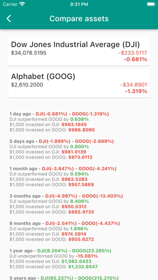 Compare the performance of two different assets, how would your investments have looked if you decided to buy a particular asset on any of the defined timestamps, how much better or worse would an asset be compared to another one with a specific value.