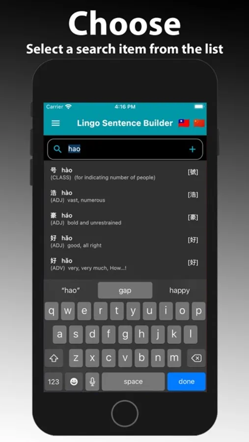 • Select the word or phrase you wish from a selectable list that automatically updates and refines your list from each letter you input into the Lingo app.