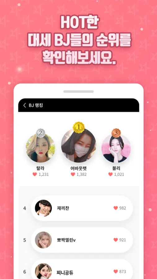 * BJ의 팬덤이 많은 순으로 랭킹을 매겨서 지금 가장 인기 있는 BJ를 알아볼 수 있어요. 응원하는 BJ의 랭킹이 낮아도 속상해 하지 마세요. 지금 바로 열혈 팬이 되고 그들에게 응원을 보내면 기쁨의 인사가 돌아올 거예요