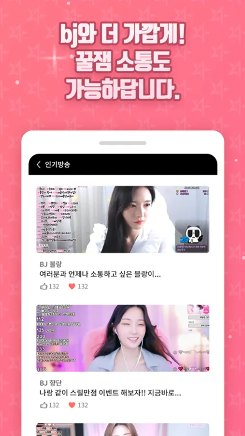 * 독보적인 큰텐츠로 매력을 뽐내는 B.J들과 적극적으로 소통하세요. BJ의 특별한 팬이 내가 되는 순간이 올 거예요!