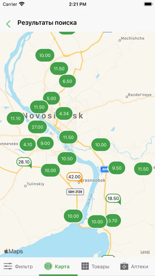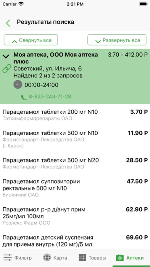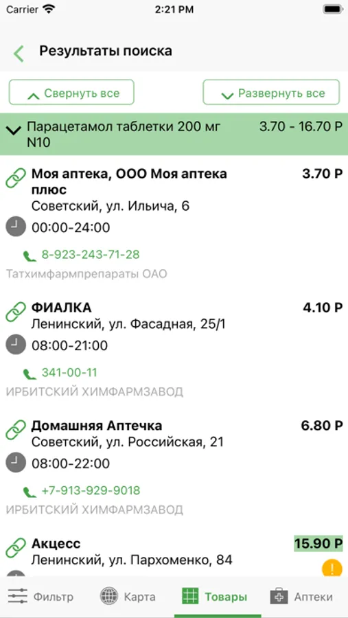 - просмотр цен в аптеках на карте и в виде таблицы с сортировкой по цене,