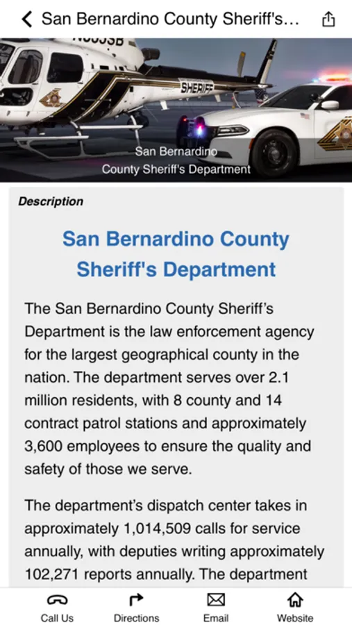 The mission of the San Bernardino County Sheriff’s Department is to provide collaborative law enforcement solutions that meet the needs of our communities and partners by delivering quality professional services to America's largest county. On behalf of the men and women of the San Bernardino County Sheriff’s Department, welcome to our app. This app is for the employees and family members of the San Bernardino County Sheriff’s Department as well as the community it serves. It contains information about our department as well as safety and crime prevention tips. San Bernardino County Sheriff’s Department employees will have access to a full range of wellness tools.