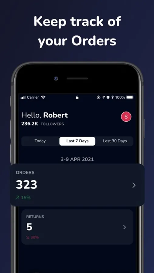 KEEP AN OVERVIEW OF YOUR BUSINESS: We're connecting your e-commerce store to Bon Merchant, so you will gain real-time insights into your followers, orders and returns to better understand your performance.