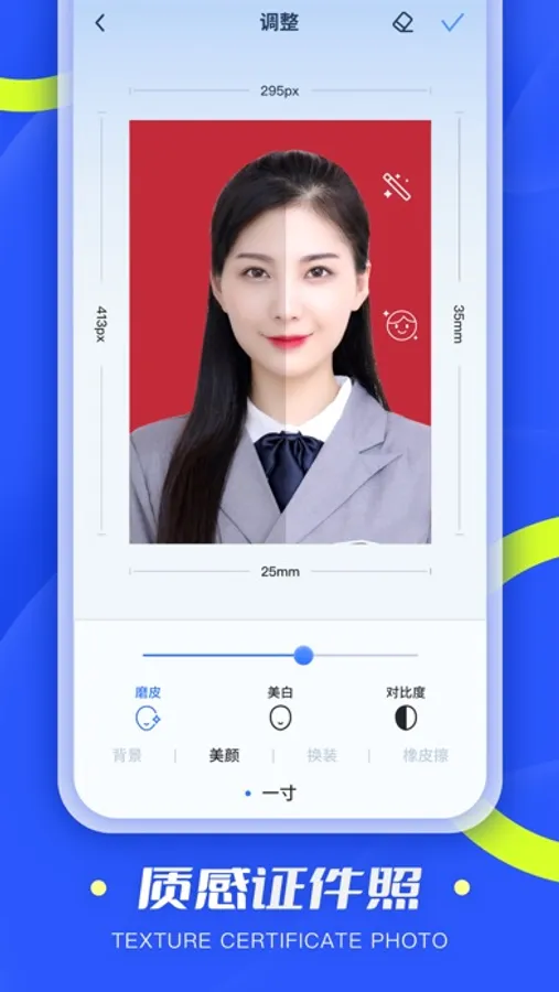 「证件照」采用AI领域先进的人工智能算法,根据不同模式精准化抠图,支持多尺寸证件照,多背景可选,制作出属于你最美证件照。