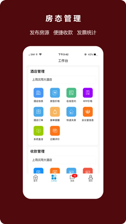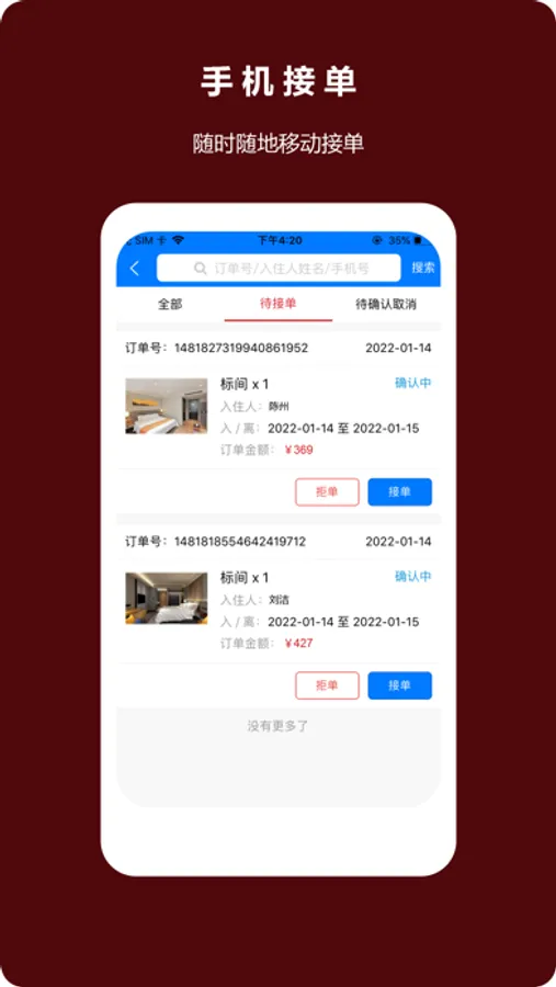 丙零接单助手APP由丙零科技向酒店合作伙伴提供,帮助酒店实现快速接单,离店收款,库存管理,实时房价管理等功能;同时能提升酒店入住率、增加客户资源、面向更多企业客户;降低了酒店的接单结算对账等环节的成本,帮助酒店实现电子化运营。