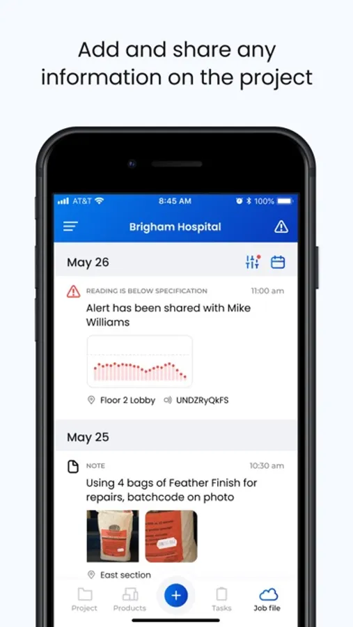 Capture & store important jobsite information (photos, notes, batch codes, etc.) in your secure, organized, Floorcloud™ database for future use.