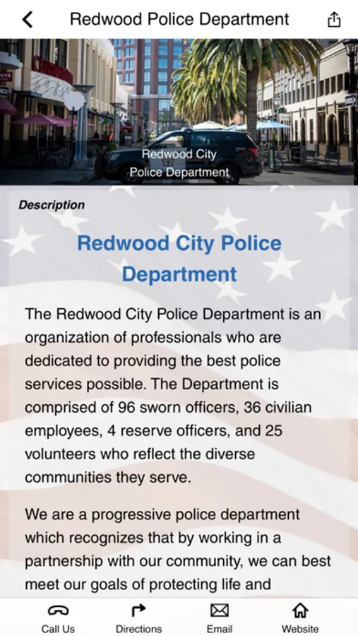 On behalf of the men and women of the Redwood City Police Department, welcome to our app. This app is for the employees and family members of the Redwood City Police Department as well as the community it serves. It contains information about our department as well as safety and crime prevention tips. Redwood City Police Department employees will have access to a full range of wellness tools.