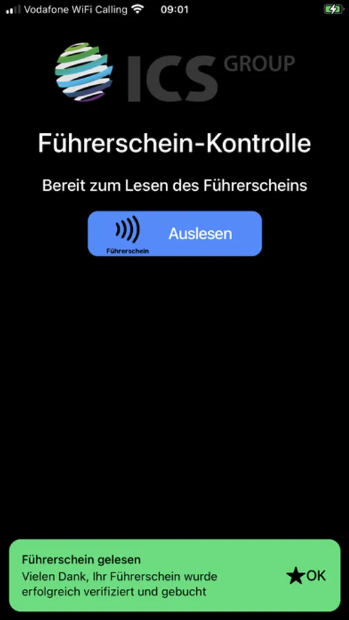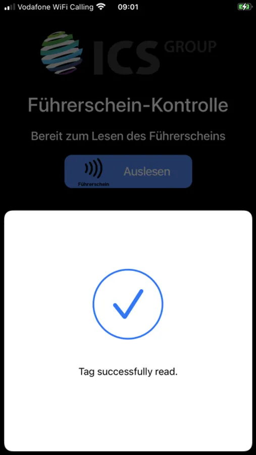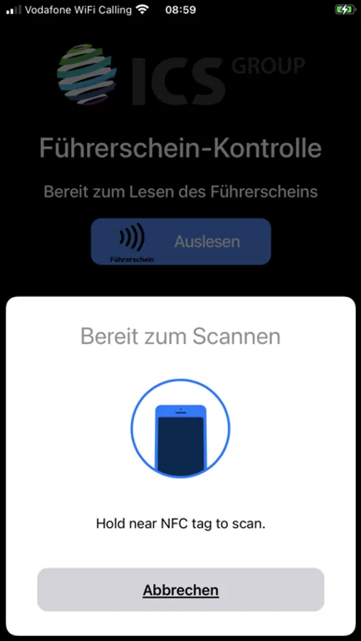 • Daraufhin erfasst er mittels der App das NFC Tag auf seinem Führerschein. Dazu drückt er/sie einfach auf den Button „Auslesen“.