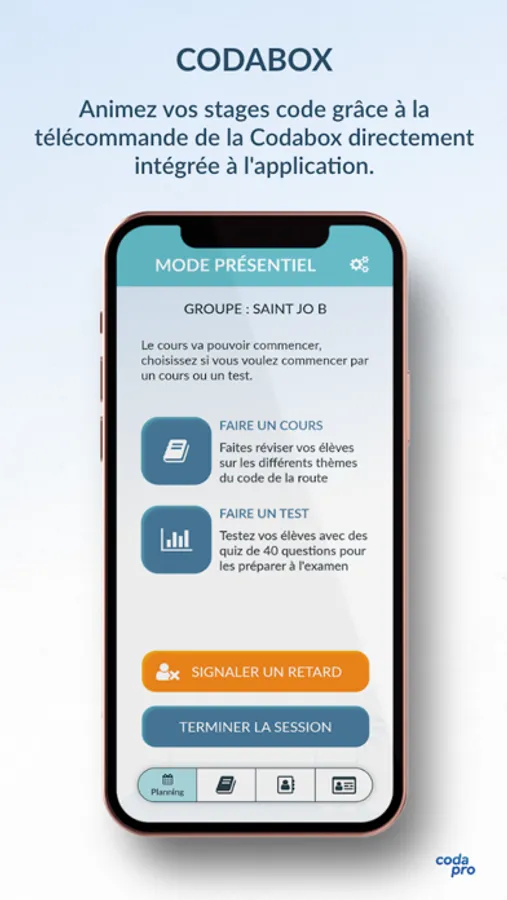 Attention, CodaPro est une application dédiée aux enseignants de la conduite partenaires du programme Codapagos. Pour plus d'information, rendez-vous sur https://codapagos.com/