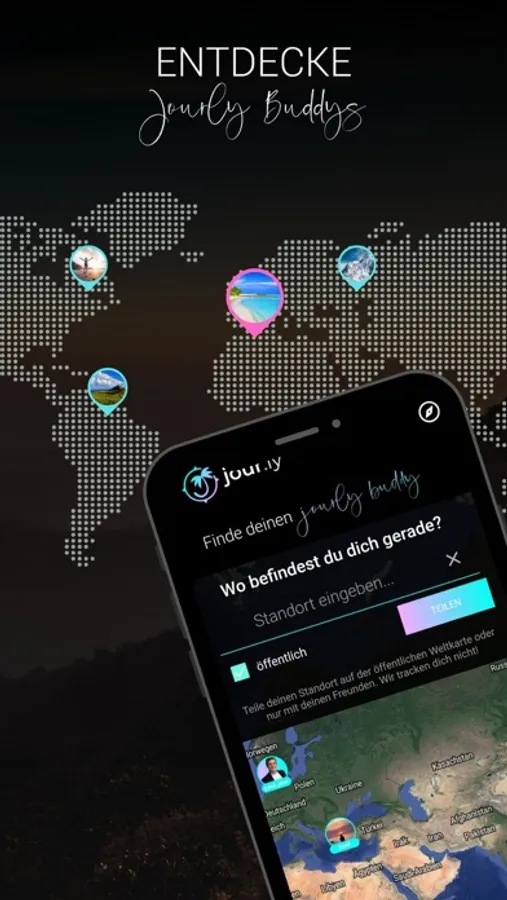 Vernetze dich auf der Jourly Map und suche nach Gleichgesinnten, die in der Nähe sind. Du bist auf der Suche nach einem Jourlybuddy? Dann teile deinen Standort und tausche dich mit anderen aus.