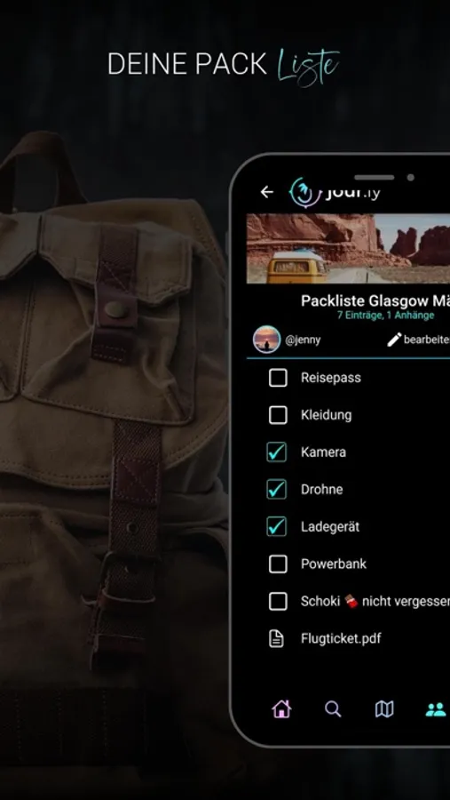 Die Vorfreude ist riesig, die positive Energie spürbar und die Kreativität blüht kurz vor Antritt deiner Reise. Plane deine Stops und erstelle deine Packlisten. Verwende die Upload Funktion, um alle Unterlagen auch während deiner Reise bereitzuhaben. Dein Jourly kann von einer einfachen Tagesreise, ein Tagesausflug zu einer tollen Location bis hin zu einem Roadtrip oder einer Weltreise sein. Du entscheidest wie dein Jourly aussehen wird. Entfalte dich frei und starte mit deinem ersten Jourly!