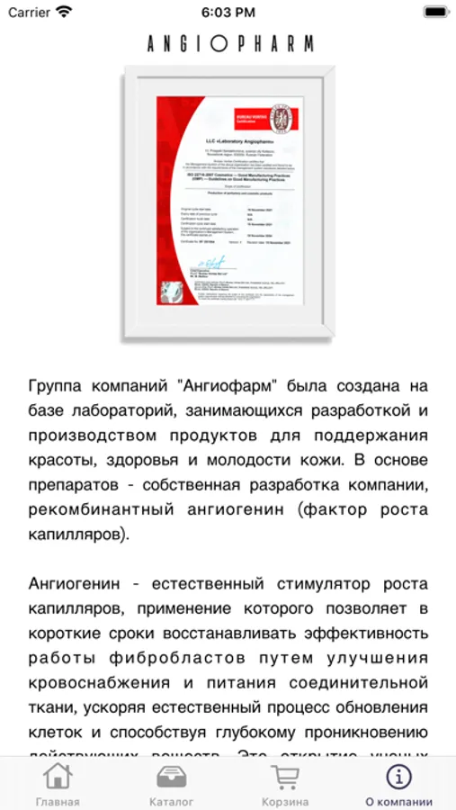 Группа компаний «Ангиофарм» была создана на базе лабораторий, занимающихся разработкой и производством продуктов для поддержания красоты, здоровья и молодости кожи. В основе препаратов – собственная разработка компании, рекомбинантный ангиогенин (фактор роста капилляров).